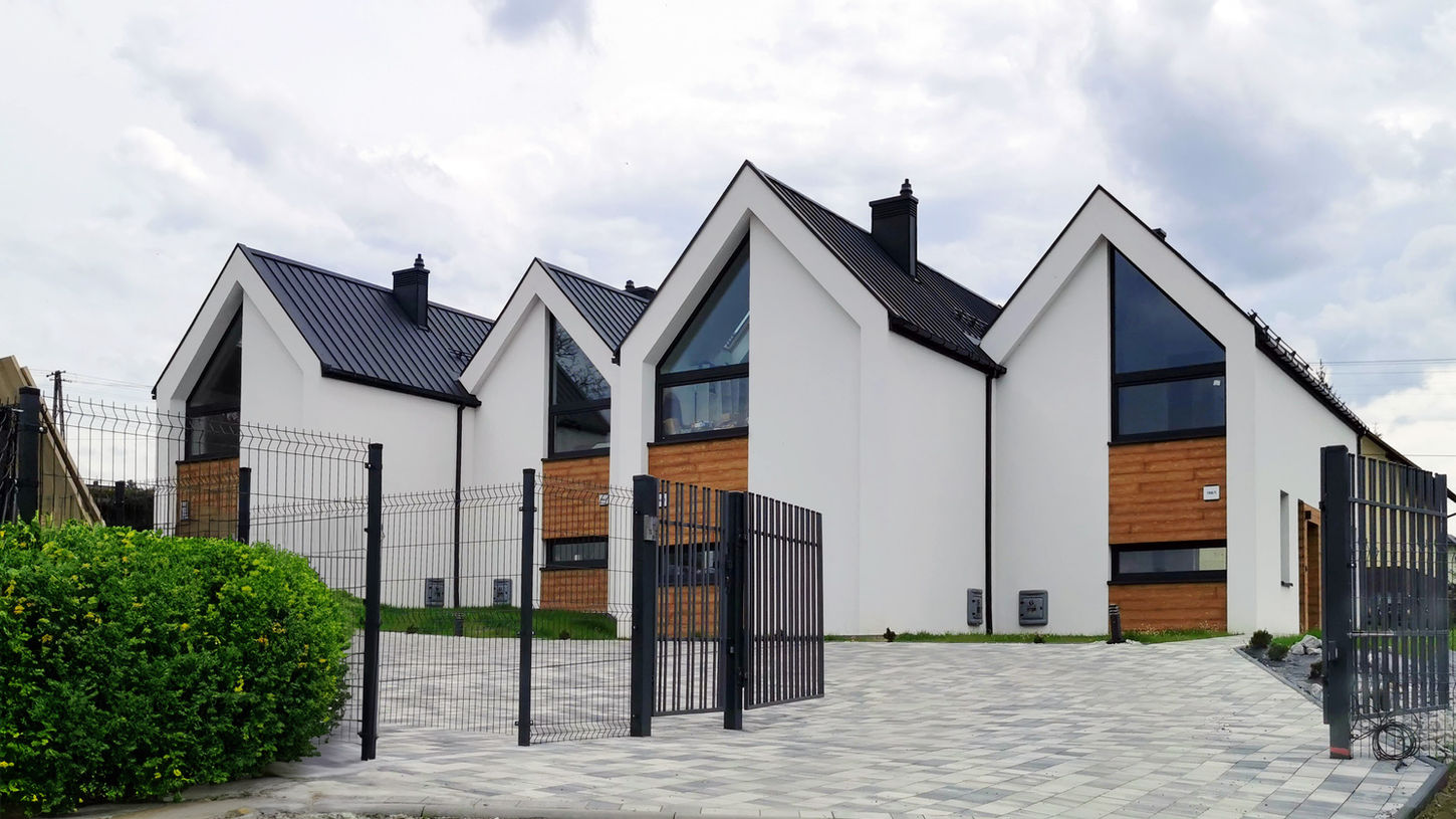 Projekt zespołu dwóch budynków mieszkalnych jednorodzinnych dwulokalowych. Prosta forma z dwuspadowymi dachami została urozmaicona dużymi przeszkleniami i naturalnym drewnem, co nadaje całości nowoczesny, a zarazem przyjazny charakter.